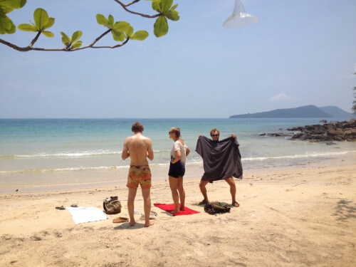 Völlig durchgeschwitzt, verkratzt und fertig versuchen wir uns einen Bus nach Thailand zu organisieren. Auch das dauert. Am Ende schaffen wir es nicht mehr an den Strand um die Ecke, bevor die Sonne weg ist.